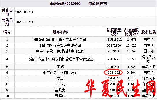 截至三季度末,中信证券股份有限公司为南岭民爆的第六大流通股股东,其持股数量为224.10万股,占流通股比例为0.604%。