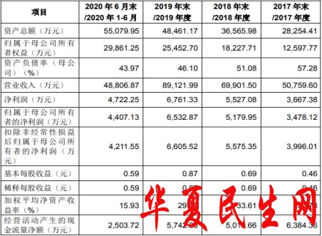 2017年至2020年上半年,公司资产总额分别达到2.83亿元、3.66亿元、4.85亿元、5.51亿元;营收分别实现5.08亿元、6.99亿元、8.91亿元、4.88亿元;归母净利润分别实现3478.12万元、5179.95万元、6532.87万元、4407.13万元;扣非净利润分别为3996.01万元、5575.35万元、6605.52万元、4211.55万元;经营活动产生的现金流量净额分别为6384.36万元、5019.66万元、5742.86万元、2503.72万元。