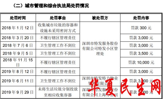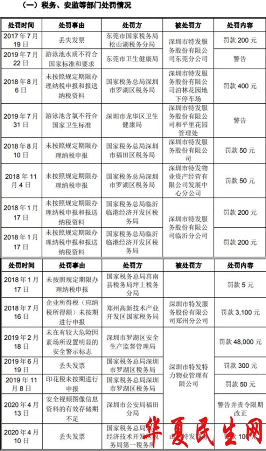 2018年7月16日,郑州高新技术产业开发区国家税务局向特发物业郑州分公司下发《税务行政处罚决定书》(郑高国税罚[2018]267号),认定特发物业郑州分公司2018年1月1日至2018年3月31日企业所得税(应纳税所得额)未按期进行申报,对特发物业郑州分公司处以罚款3100元。违法行为发生的原因为公司郑州分公司被税务机关处以罚款的原因为相关财务工作人员的税务申报工作经验不足,疏忽大意未按时申报,不存在故意违反税收管理规定的情形。