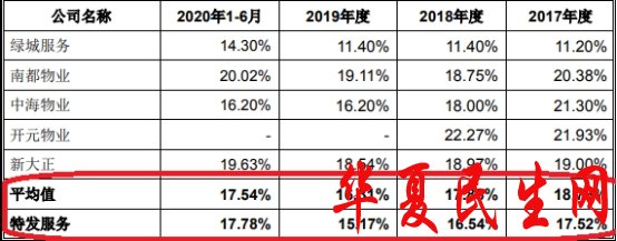 公司毛利率连降3年且低于行业平均值。2016年至2019年,特发服务综合毛利率分别为23.98%、21.96%、21.05%、18.65%,2020年上半年有所回升,为20.53%,其中,综合物业管理服务毛利率分别为18.82%、17.52%、16.54%、15.17%,2020年上半年为17.78%;主营业务毛利率分别为23.98%、21.92%、20.97%、18.60%,2020年上半年为20.60%。公司称,报告期内,综合物业管理业务的收入、毛利占比较高,系影响公司综合毛利率的主要因素。公司综合物业管理业务毛利率水平主要与物业服务项目的收费标准、业态构成、成本管控,以及各项目收入来源等因素相关。未来,随着物业管理行业竞争进一步加剧及人力成本等主要成本的上升,公司可能面临毛利率下降的风险。