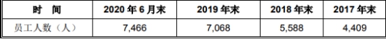 特发服务2019年员工人数7068人,2000人未缴住房公积金。2017年末至2020年6月末,特发服务在册员工人数分别为4409人、5588人、7068人、7466人。