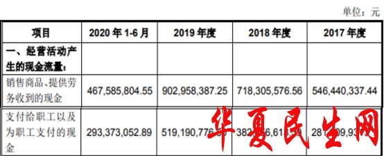 2017年至2020年上半年,公司销售商品、提供劳务收到的现金分别为5.46亿元、7.18亿元、9.03亿元、4.68亿元;支付给职工以及为职工支付的现金分别为2.82亿元、3.83亿元、5.19亿元、2.93亿元。