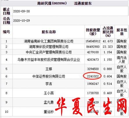 截至三季度末,中信证券股份有限公司为南岭民爆的第六大流通股股东,其持股数量为224.10万股,占流通股比例为0.604%。