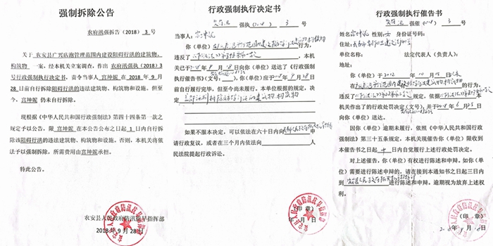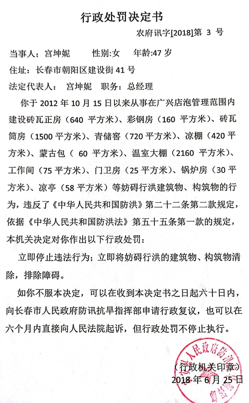 宫坤妮们的说法得到了政府文件的印证。记者从宫坤妮那里看到了几份政府文件,有《处罚告知书》、《强制拆除公告》、《行政强制执行决定书》、《行政强制执行催告书》等,都是农安县人民政府防汛抗旱指挥部做出的,其中2018年6月25日对宫坤妮做出的行政处罚决定书(农府讯字[2018]第3号)称:“你于2012年10月15日以来从事在广兴店泡管理范围内建设砖瓦正房(640平方米)、彩钢房(160平方米)、砖瓦筒房(1500平方米)、青储窖(720平方米)、凉棚(420平方米)、蒙古包(60平方米)、温室大棚(2160平方米)、工作间(75平方米)、门卫房(25平方米)、锅炉房(30平方米)、凉亭(58平方米)等妨碍行洪建筑物、构筑物的行为,违反了《中华人民共和国防洪法》第二十二条第二款规定,依据《中华人民共和国防洪法》第五十五条第一款的规定,本机关决定对你作出以下行政处罚:立即停止违法行为;立即将妨碍行洪的建筑物、构筑物清除,排除障碍。