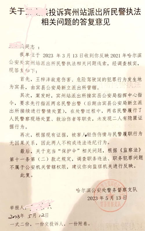 现场出警警察马相云的执法记录仪显示:谭天义(当时为政协委员)到场后,其听信母亲耿吉云虚假叙述王梓沣行为后,立即动手殴打了王梓沣,当时出警的警察王雪东(哈尔滨铁路公安处宾州站派出所所长)、马相云(宾州站民警)不予制止的行为,纵容了谭天爽、李成龙、窦广君前来多次群殴王梓沣,四人殴打行为,造成王梓沣头面部轻伤二级的后果。王梓沣在警察面前被打伤后无人管后,在听到有人喊“揍他”,为了保命,不得已驾驶不到100米的距离被逼停后,窦广君与陈忠成将王梓沣的车辆砸毁,警察王雪东、马相云也不制止,反而在新立派出所向其调查时,谎称其没有看到谭天义殴打王梓沣,来充分犯罪团伙的保护伞。
