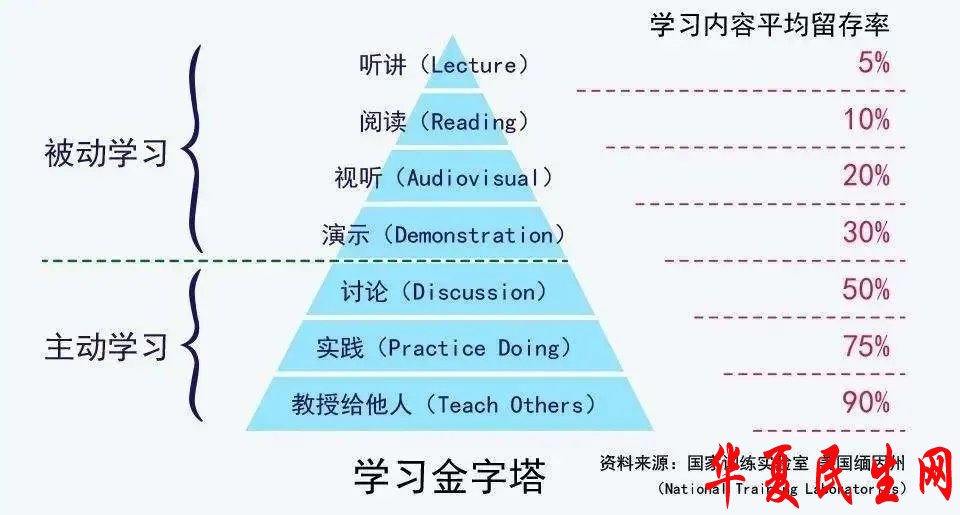 同样的课程资源,既可以上成一堂普通平凡的课,也可以升级为具有创新特色的魅力课、优质课。科学研究表明,学习的效能是金字塔形的:最上面的一级就是听,孩子们如果只是靠听讲的方式吸收知识,他记住的效能是5%;阅读,视听,演示,三种方式逐渐增高;通过讨论学习的效能已经超过50%;而如果通过解决问题来学习,学生掌握知识的效能约为75%;通过自己消化后再系统讲述给别人,他记住自己所学的机率为90%......