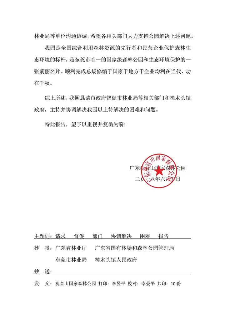 从上可见,广东观音山国家森林公园面临着种种不法侵害并非企业自身造成,一方面公园管委会应当坚持协商对话、依法诉讼,维护其权益,维护东莞市的青山绿水和公共利益,另一方面东莞市政府及部门应当遵守《国务院产权保护指导意见》《国务院优化营商环境条例》,履行其法定职责,从行政上法律法规上落实对公园合法经营权的保护。建议广东省省委书记、省政法委书记督促东莞市肃清刘志庚余毒,落实相关法律法规,解决观音山国家森林公园长期存在的问题;建议中央督察组环保督察、国务院行政督察及时介入,纠正地方政府不作为、不执法、违法行政、纵容损害、破坏国家级森林公园的渎职违法行为。(陈晖)