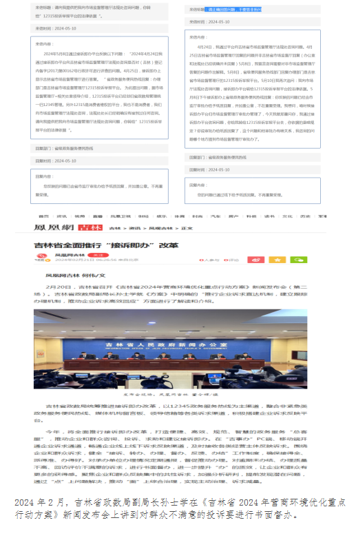 5月8日,他们再次给接诉即办平台去信,希望对4月25日的回复做出解释说明,究竟是哪个部门的答复。下午,接诉即办平台回复说是:办理部门是吉林省市场监督管理厅12315投诉举报平台。陈广田们再次分别向市场监督管理投诉举报中心和权益保护中心进行电话核实。投诉举报中心表示12315投诉举报中心和吉林省市场监督管理厅没有关系。权益保护处黄处长也表示,12315投诉举报中心属于吉林省政数局了。