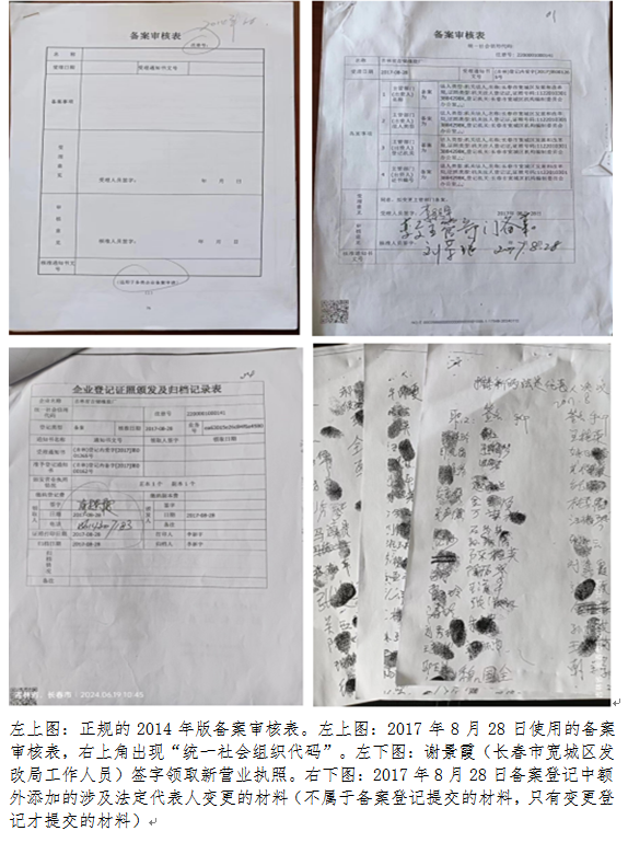 2024年3月14日,吉林省市场监督管理厅确认7年前即2017年8月28日吉林省吉储橡胶厂主管部门变更备案登记依据的是《非公司企业法人登记提交材料规范》(2014年版)。经过调取,吉林省吉储橡胶厂在2017年8月28日的备案登记档案中发现:备案登记中缺少必要的“备案事项证明文件”:“变更前主管部门的上级单位的批准文件和变更后的主管部门的上级单位批准文件”,并且还在备案登记中放置了属于“变更登记”的涉嫌法定代表人变更的材料(附件5、附件6、附件7)。档案中的备案申请表中出现了“统一社会组织代码”字样,而统一社会组织代码却是在2015年10月1日国家标准委发布了强制性国家标准《法人和其他组织统一社会信用代码编码规则》后才出现的。并没有依据《非公司企业法人登记提交材料规范》(2014年版)要求进行操作。2017年8月28日,陈宇担任登记注册处(当时叫企业处)副处长,成刚担任登记注册处处长,陈宇作为企业处副处长他应该知道这是不对的。况且陈宇是全程参与了这个事情,在我们吉林省吉储橡胶厂职工去吉林省市场监督管理厅询问的时候,也是陈宇给做出解释的。