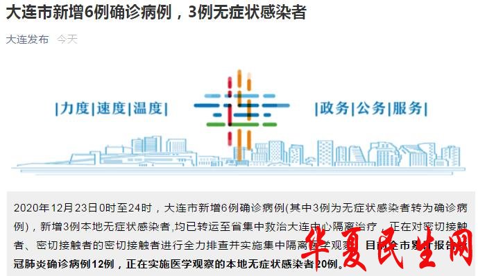 中国网12月24日讯 据大连市人民政府新闻办公室微信公众号消息,2020年12月23日0时至24时,大连市新增6例确诊病例(其中3例为无症状感染者转为确诊病例),新增3例本地无症状感染者,均已转运至省集中救治大连中心隔离治疗,正在对密切接触者、密切接触者的密切接触者进行全力排查并实施集中隔离医学观察。目前全市累计报告新冠肺炎确诊病例12例,正在实施医学观察的本地无症状感染者20例。