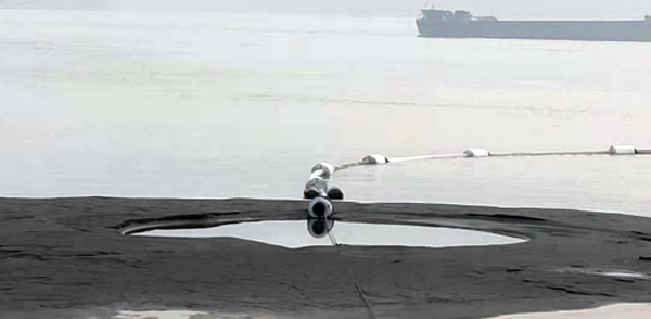 大量沙子从临建码头河床附近通过这个管道口抽出到300米外的河床(2020年12月28日下午5时30分拍摄)