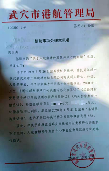 面对这份信访处理文件周江涛说:“武穴市在强拆我的码头前,故意将矿山运输廊道对接到无手续、规划不合理的武汉港航武穴码头,我有手续的码头反而不给做货源规划,说白了,是有意卡脖子。我曾要求武穴市人民政府和我签订码头整合框架协议,原武穴市港航管理局局长项国胜(现提升为武穴市交通局局长)说不存在签什么协议。就这样把我的码头强行拆掉了。因此我逐级反映问题,迟迟得不到解决。最后我去北京上访,武穴市公安部门以寻衅滋事为由将我拘留,2019年1月把我关押181天,2019年底将我判三缓四。