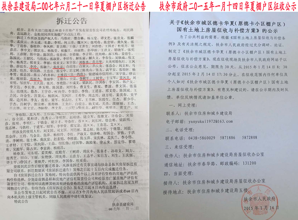 采访中,德卡公司向记者提供了2007年6月21日扶余市建设局棚户区拆迁公告和2015年1月14日发布的扶余市政府关于《扶余市城区德卡华夏(原德卡小区棚户区)国有土地上房屋征收与补偿方案》的公示。根据这两份文件,该棚户区改造是由政府主导拆迁工作,由政府拆迁补偿完毕后交由地产商建设。但是,扶余市政府的不作为或称懒政、惰政,不仅使30多户居民处于无法回迁的尴尬境地,也使地产商蒙受了巨大损失,地产商和居民们说。