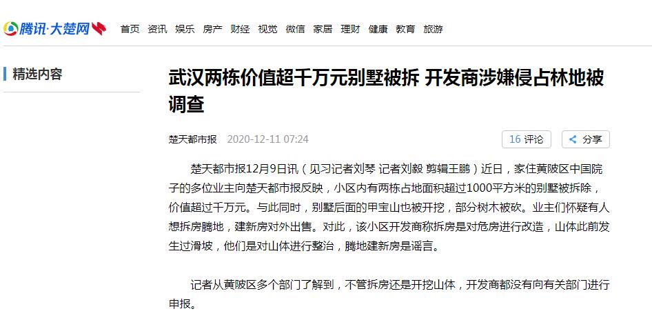 武汉两栋价值超千万元别墅被拆 开发商涉嫌侵占林地被调查