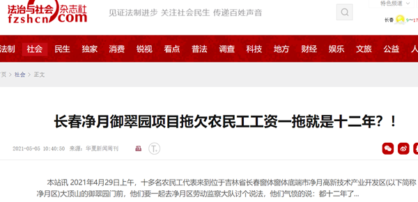 2021年4月29日上午,十多名农民工代表来到位于吉林省长春窗体窗体底端市净月高新技术产业开发区(以下简称净月区)大顶山的御翠园门前,他们要一起去净月区劳动监察大队讨个说法,他们气愤的说:“都十二年了,因为大包赌博输掉了血本,吉润公司(全称:长春市建工新吉润公司)拖欠我们农民工的工资还没有结清,为了讨回自己的血汗钱,我们历尽艰难曲折,有的已经倾家荡产,还有的已经家破人亡了,可是他们就是不给,我们一定要讨个说法!”