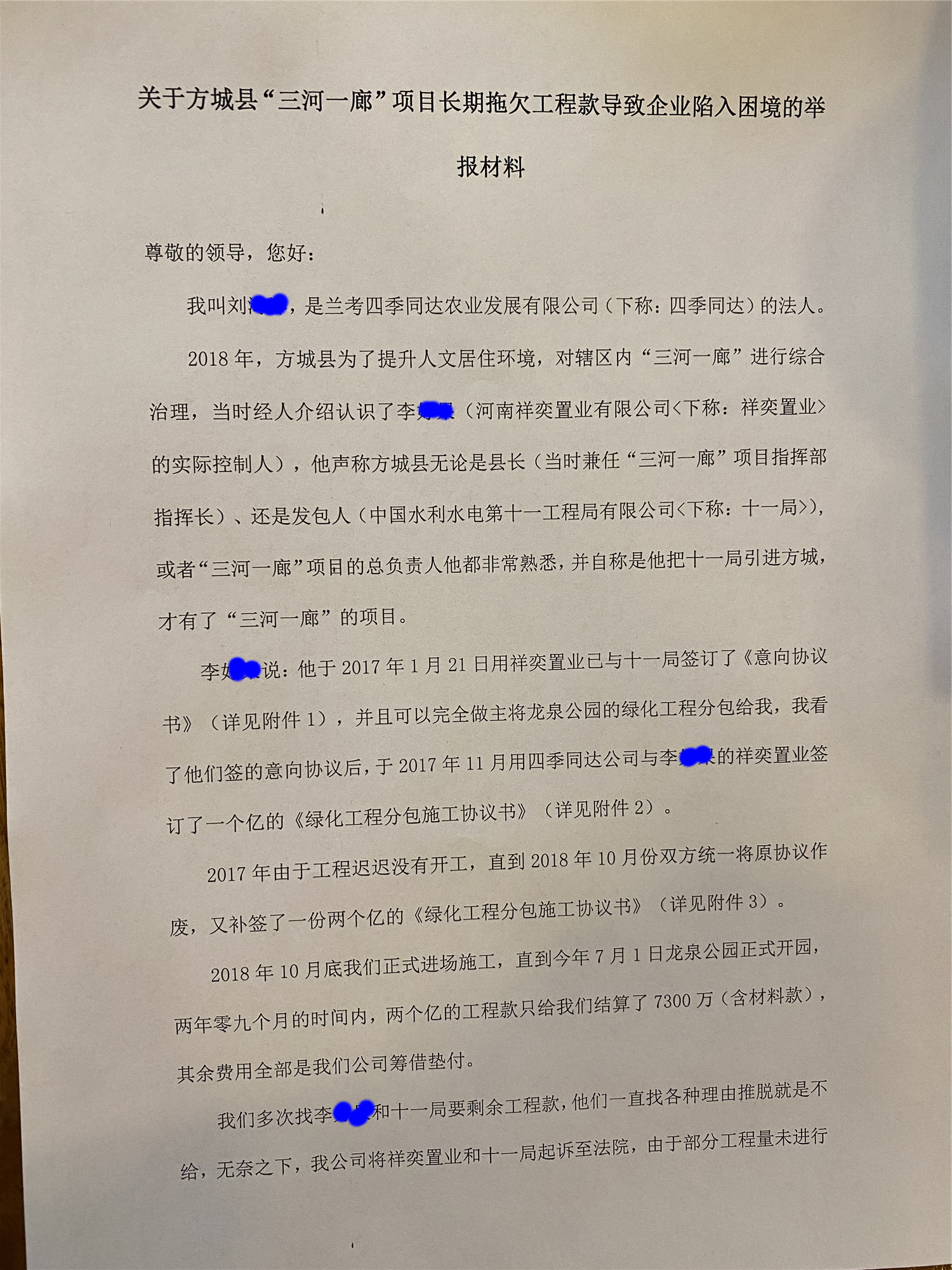 关于方城县“三河一廊”项目长期拖欠工程款导致企业陷入困境的举报材料