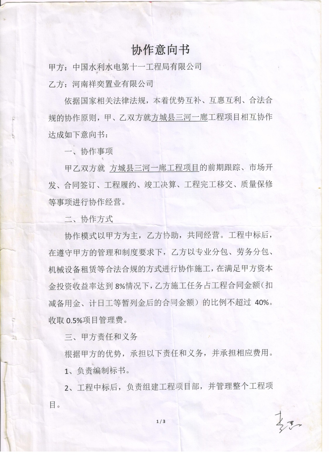 2018年,方城县为了提升人文居住环境,对辖区内“三河一廊”进行综合治理,当时经人介绍认识了李XX(河南祥奕置业有限公司<下称:祥奕置业>的实际控制人),他声称方城县无论是县长(当时兼任“三河一廊”项目指挥部指挥长)、还是发包人(中国水利水电第十一工程局有限公司<下称:十一局>),或者“三河一廊”项目的总负责人他都非常熟悉,并自称是他把十一局引进方城,才有了“三河一廊”的项目。