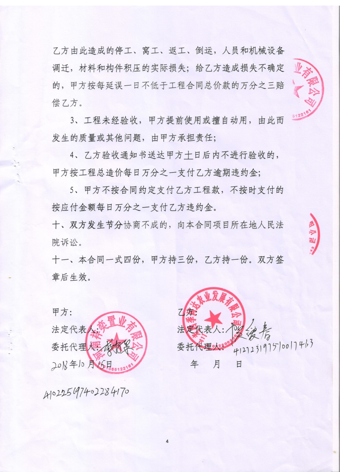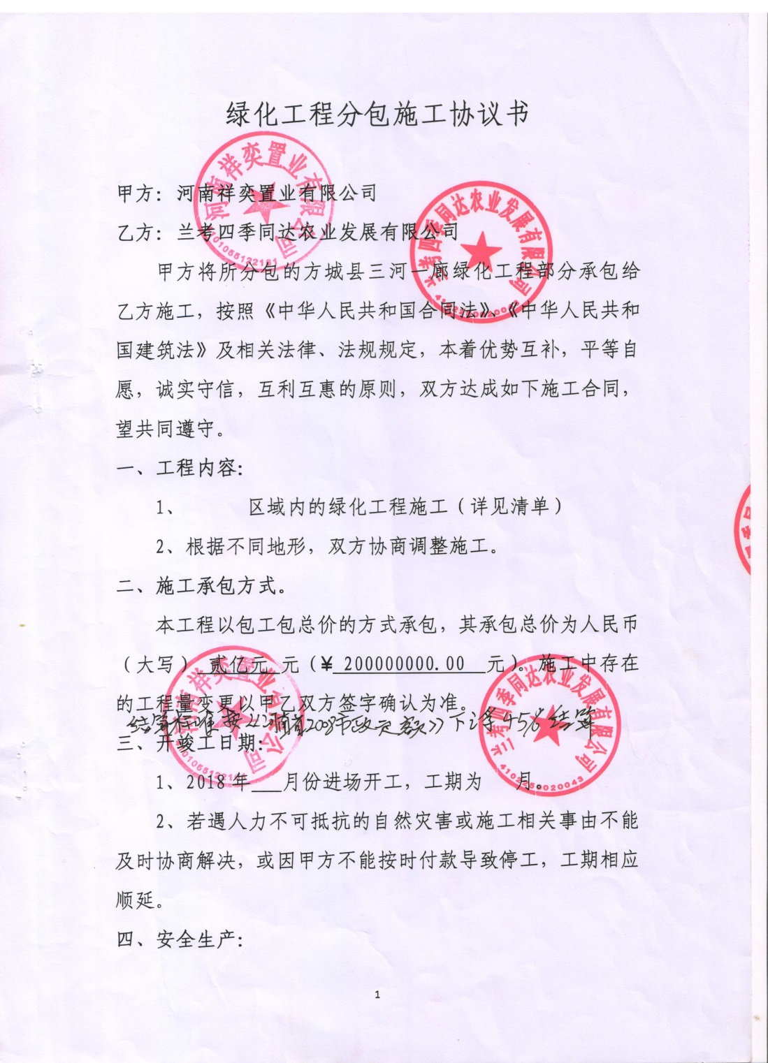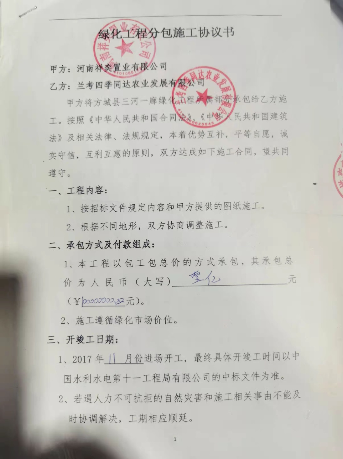 2017年由于工程迟迟没有开工,直到2018年10月份双方统一将原协议作废,又补签了一份两个亿的《绿化工程分包施工协议书》(详见附件3)。