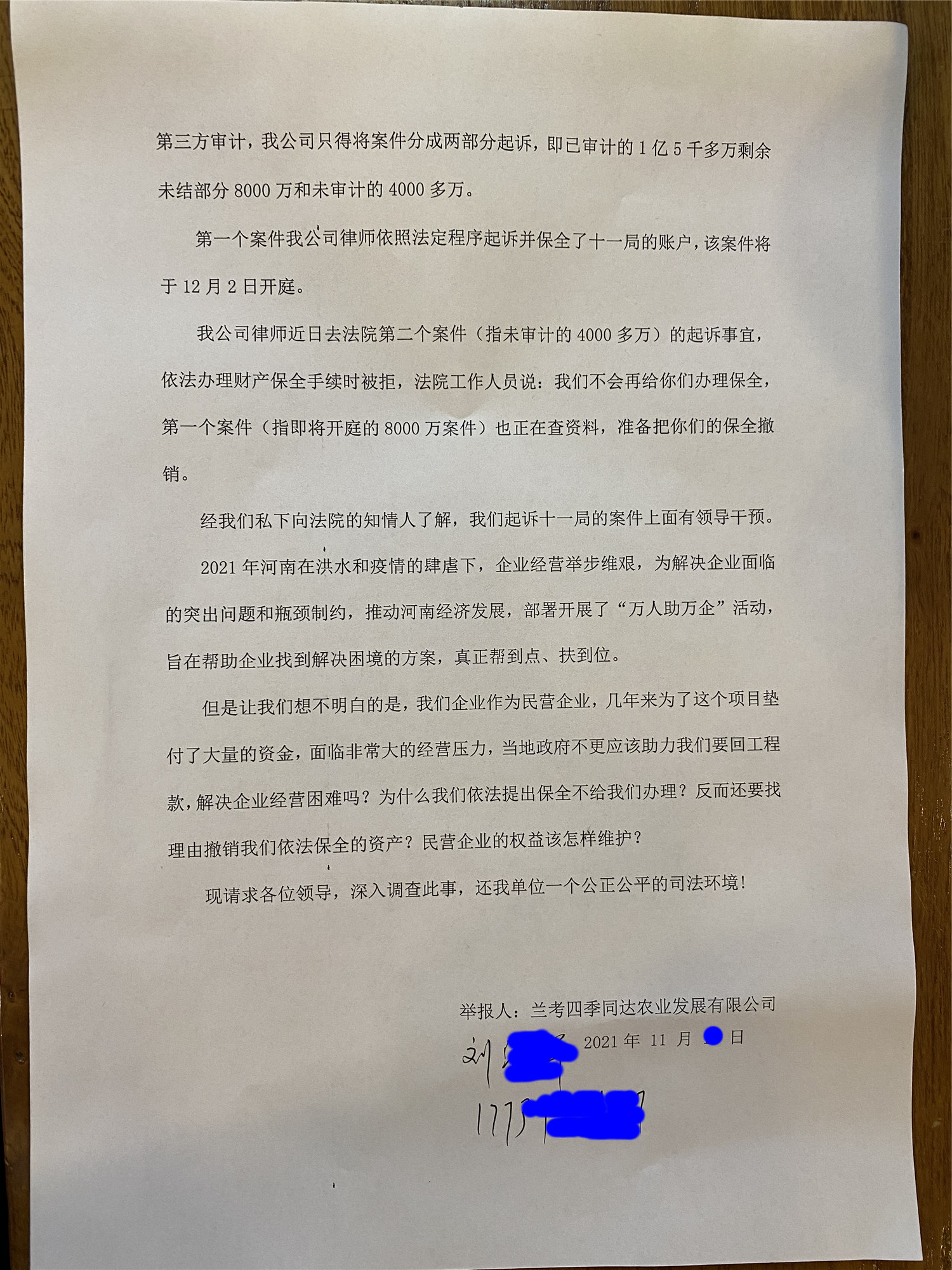 我公司律师近日去法院第二个案件(指未审计的4000多万)的起诉事宜,依法办理财产保全手续时被拒,法院工作人员说:我们不会再给你们办理保全,第一个案件(指即将开庭的8000万案件)也正在查资料,准备把你们的保全撤销。