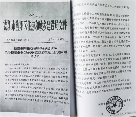 记者了解到,作为建设领域招投标的行政、法制管理单位,旌阳区住建局本可以对辖区内建设领域的招投标行为依法裁决即可,为什么旌阳区住建局还以专函德市旌建【2021】29号向德阳市住建局请示非常明确的招标文件1.4.3条款“近三年”的理解呢?而德阳市住建局回复旌阳区住建局称电话请示四川省发改委、省招标总站,答复“近三年”的理解,理解应以司法判定为准。于是,旌阳区住建局拿着德阳市住建局的“电话请示”做裁定了,于2021年7月20作出裁定:撤销湖南六建在德阳党校迁建项目第一候标人资格。