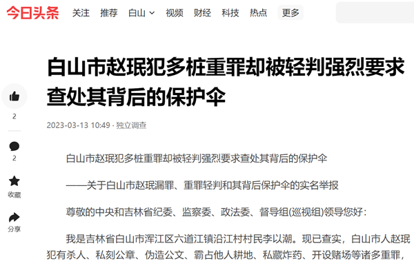 白山市赵珉罪恶累累却被重罪轻判请求严查其保护伞并赔偿损失