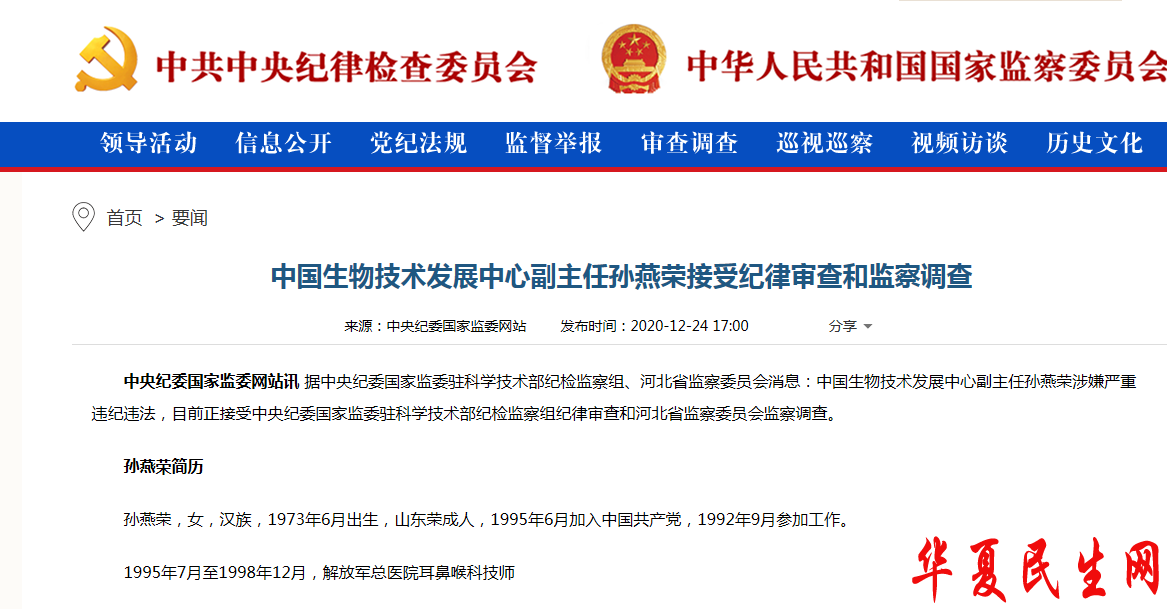 中国生物技术发展中心副主任孙燕荣涉嫌严重违纪违法被查