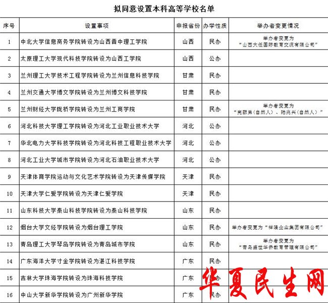中国网12月24日讯 教育部今日发布《关于拟同意设置本科高等学校的公示》,公示称,根据《高等教育法》《普通高等学校设置暂行条例》《普通本科学校设置暂行规定》和《关于加快推进独立学院转设工作的实施方案》等法律法规政策规定,经第七届全国高等学校设置评议委员会专家考察和评议,并经党组会审议,拟同意中北大学信息商务学院等33所独立学院转设为独立设置的本科学校,现将学校名单等信息向社会公示。